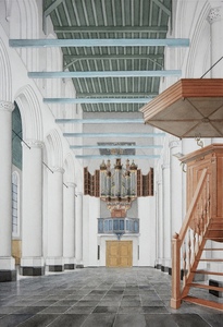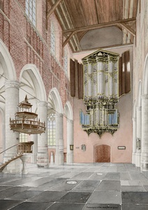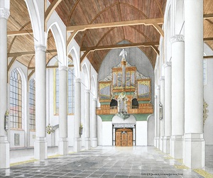 2004Een aquarel in overhoeks perspectief. Gezien vanuit de noorderzijbeuk naar het feestelijk geschilderde orgel met beschilderde luiken. Tegen de pilaar op de voorgrond de zgn.prinsenbank.