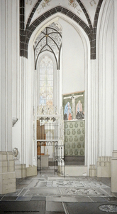 2022Vanuit de zuidelijke kooromgang een doorzicht over het koor naar de Credokapel. Op de voorgrond het koororgel (1960) welke Ahrend & Brunzema bouwde. De twee voorste pilaren zijn kleurrijk beschilderd met fresco's, twee van de vele fresco's die deze kerk sieren. Naast dit instrument bezit de kerk het beroemde Hendrick Baderorgel (1639/1643). Een aquarel in een overhoeks perspectief.