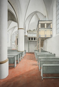 2009Een centraal perspectief geschilderd van oost naar west in de noordelijke zijbeuk. Een kerk met een houten tongewelf in twee richtingen, ook wel 'Haagse hallenkerk' genoemd.